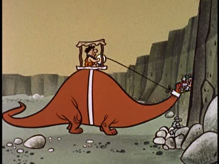 RIG: The Flintstones car. You know, the one that requires the driver to run really fast -- while sitting down -- in bare feet to make the car move. It seems like a really poor vehicle to transport a large quantity of goods, but apparently nobody was smart enough to hook one of these floorless and human-powered vehicles up to a dinosaur so that the animal could pull the damn thing. I mean, they used dinosaurs as cranes and earth mover-type things; why wasn't anybody smart enough to hook one of the pseudo-cars up o a powerful dinosaur? I don't get it. Anyway, VMI is driving that.